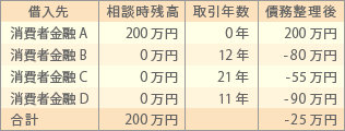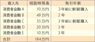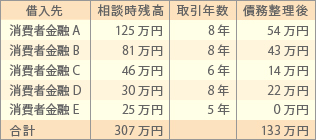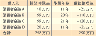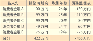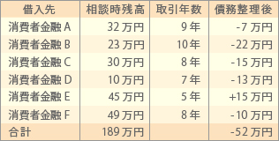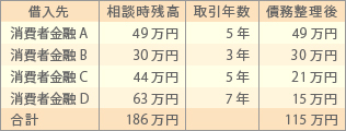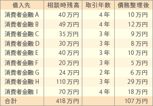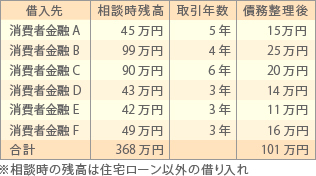 親元を離れ10年以上東海地方で独身生活をしていらっしゃいました。仕事もアルバイトが長く続き、引っ越しな どで費用がかさみ借り入れが返済能力を超えてしまった状況で、友人の勧めで整理を決意されました。